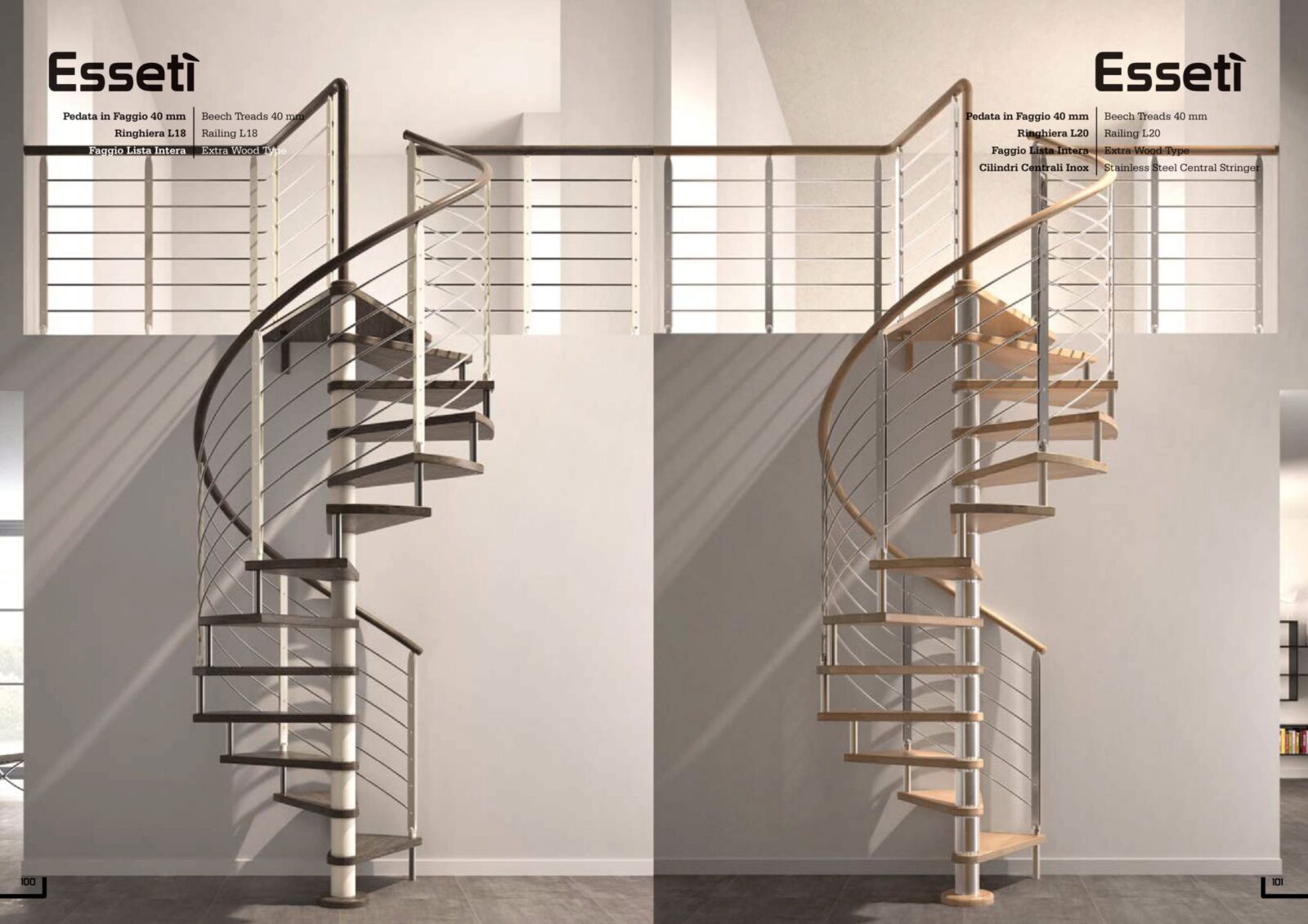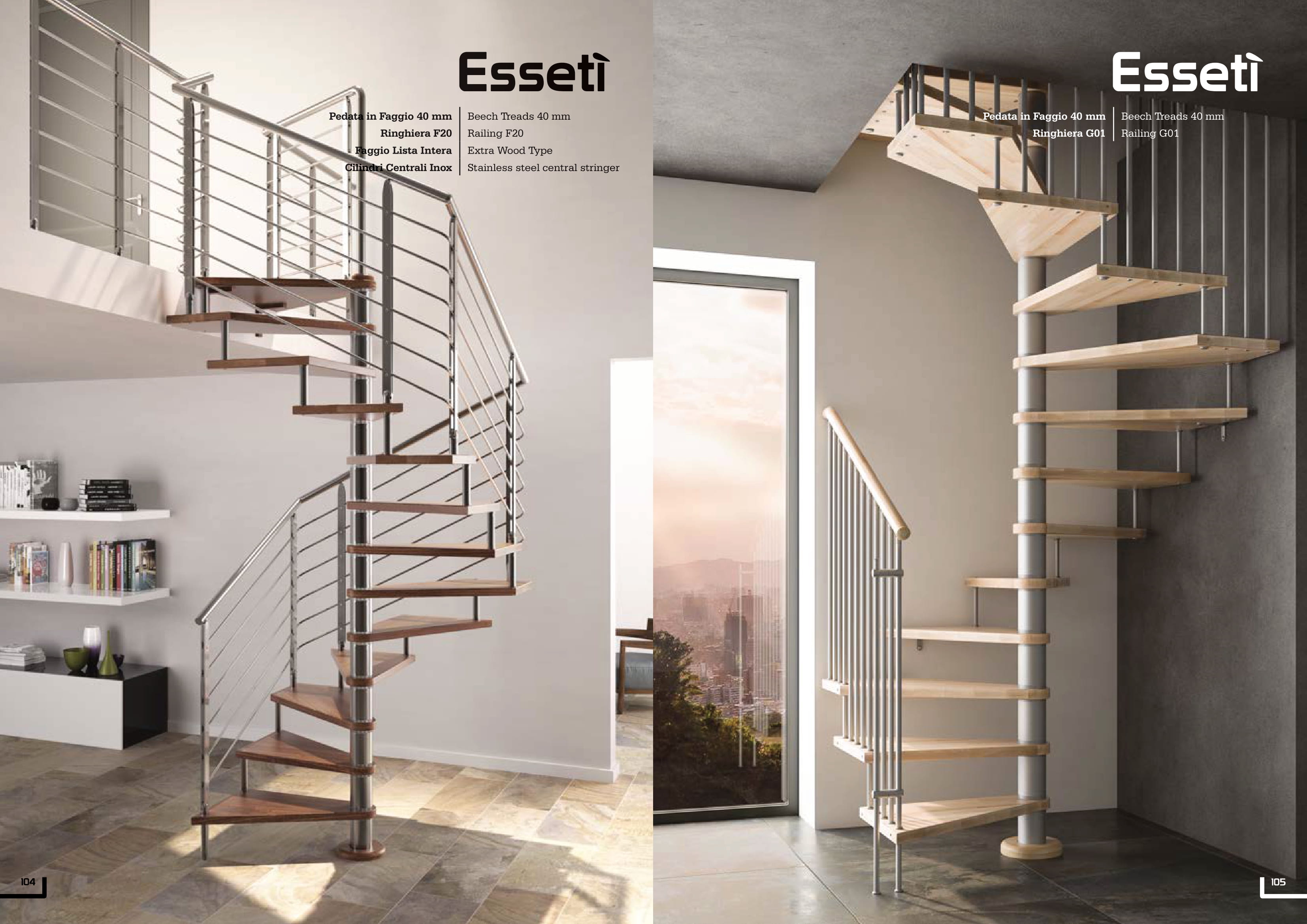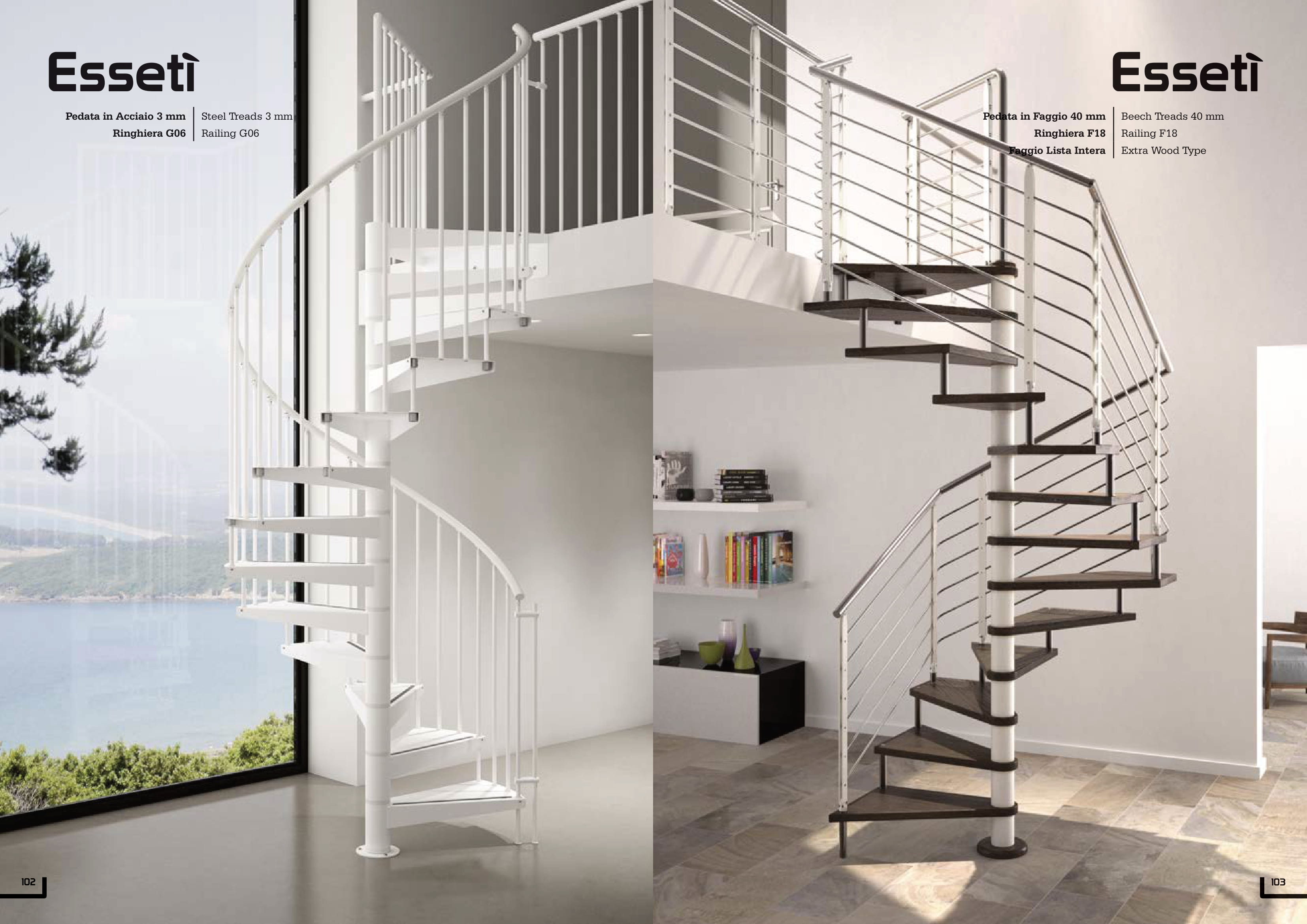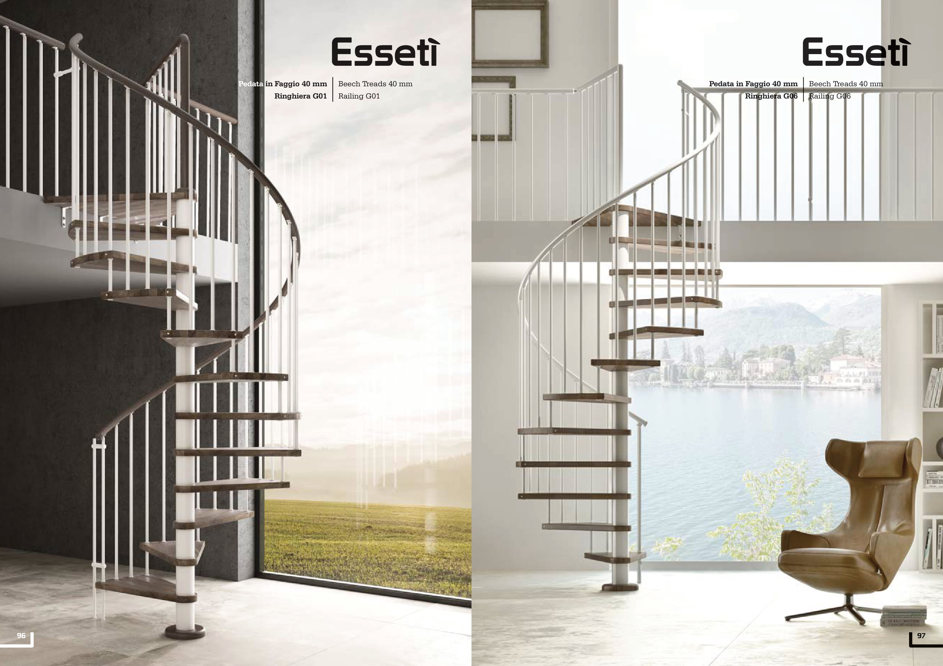 Scale a chiocciola a pianta circolare o a pianta quadra, con palo centrale rivestibile in faggio, in acciaio verniciato o in acciaio inox satinato. Nel cilindro in acciaio verniciato e in acciaio inox satinato sono previsti distanziali in policarbonato per la regolazione dell’alzata. Fornibile con pedate in faggio, in faggio rustico, in rovere, in acciaio verniciato, in vetro trasparente o in vetro extrachiaro.