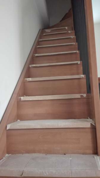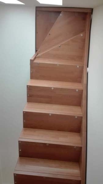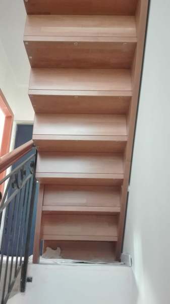 eseguita in legno di faggio finger joint spess. mm.42; struttura sagomata sotto gradino di arrivo a soletta.