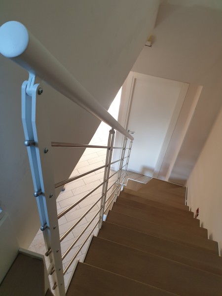 Scala a giorno mod. “Libra C11” con Doppia struttura in Ferro con disegno  scalettato, eseguita in acciaio verniciato spessore mm. 10; struttura a muro rovesciata per vincolo vano porta di accesso. Gradini in legno massello di faggio lucidato dello spessore di mm. 40; colore Tortora; finitura spazzolata. Fissaggio gradino inferiormente alla struttura; frontalino di arrivo a soletta; lucidatura legno,  vari colori da campionario; verniciatura ferro alle polveri epossidiche, colore bianco goffrato. Ringhiera, solo lato interno, “mod. C11” con montanti verticali doppia piatta taglio laser; fino a n.° 6 correnti orizzontali a tubini in acciaio; corrimano cilindrico in metallo verniciato