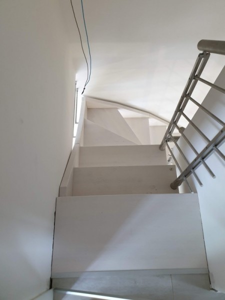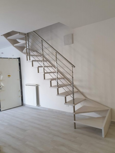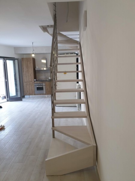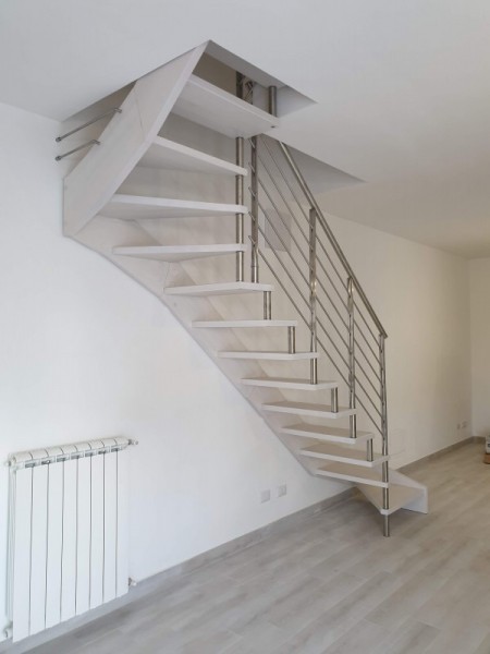 eseguita in legno di faggio spess. mm.42; struttura sagomata sotto gradino di arrivo a soletta. Gradini in