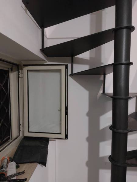 Scala a chiocciola delle dimensioni cm 130/140 a pianta quadrata con ringhiera parziale,