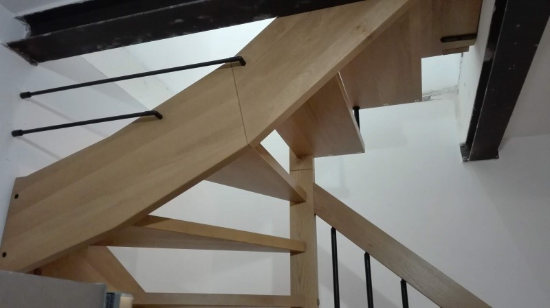 Scala a giorno con unica struttura in legno a fascione, eseguita in legno di faggio finger joint, spessore mm. 40.